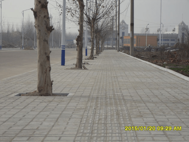我公司組織施工的“羅山縣產(chǎn)業(yè)集聚區(qū)部分主干道人行道道路硬化一標(biāo)段”經(jīng)過90天的緊張施工,現(xiàn)已全面完工。該標(biāo)段包括羅山縣產(chǎn)業(yè)集聚區(qū)站前西道(局部)和工業(yè)大道(局部)人行道建設(shè)工程。其中站前西道人行道建設(shè)工程施工長度為602.4M;工業(yè)大道人行道建設(shè)工程施工長度為630.5M,兩路段工程寬度皆為5M,結(jié)構(gòu)層從下至 上依次為:8CM碎石基層、10CM砼墊層、3CM水泥砂漿結(jié)合層、6CM人行道磚。該工程正在準(zhǔn)備驗(yàn)收。